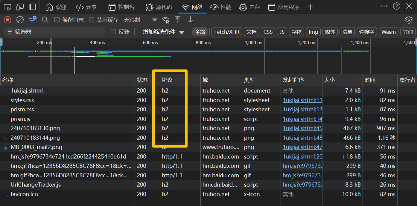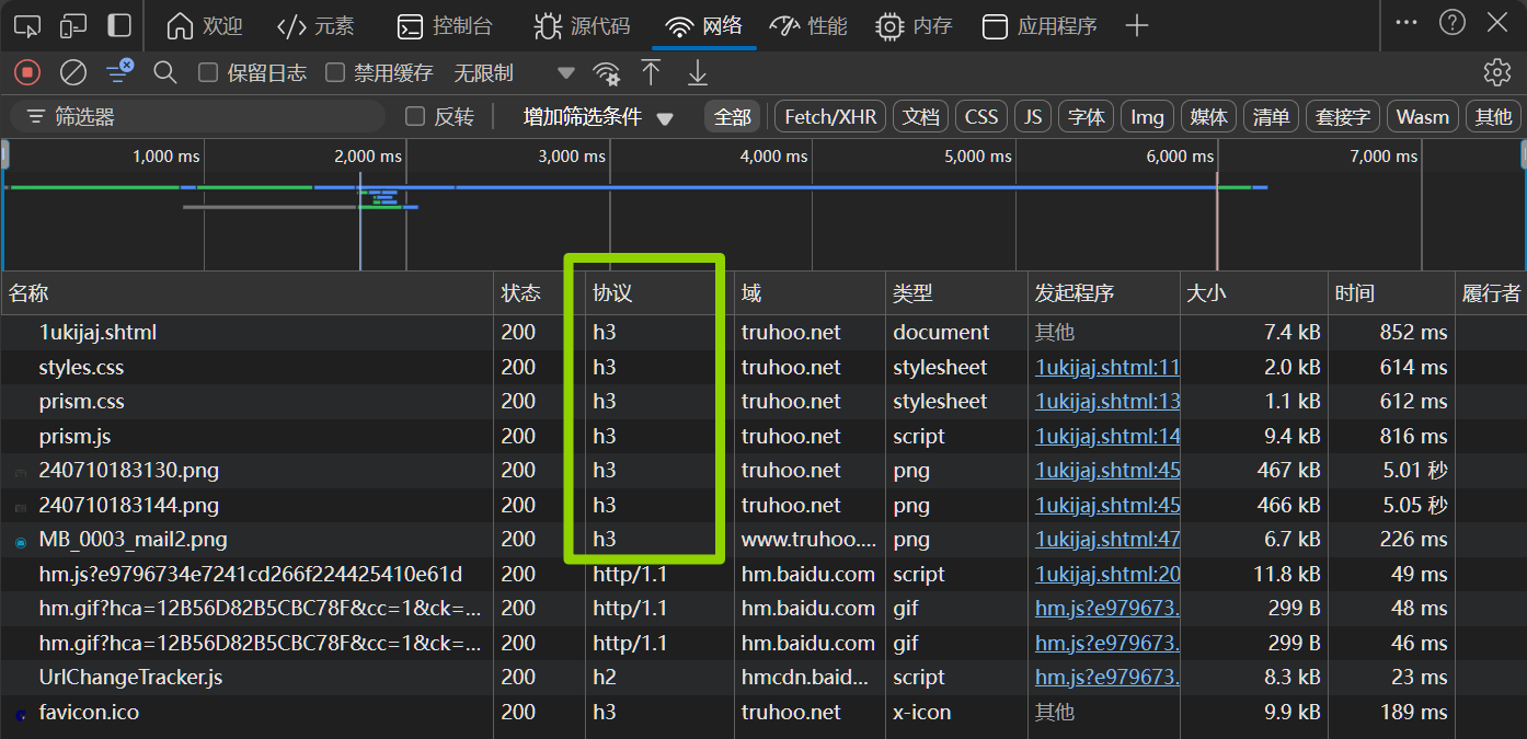 配置完成后,重启nginx,访问站点,通过Edge浏览器或者Chrome的“开发人员工具”查看网络请求数据,可以在网络-协议栏看到是HTTP/2的是h2,HTTP/3是h3,如图示: