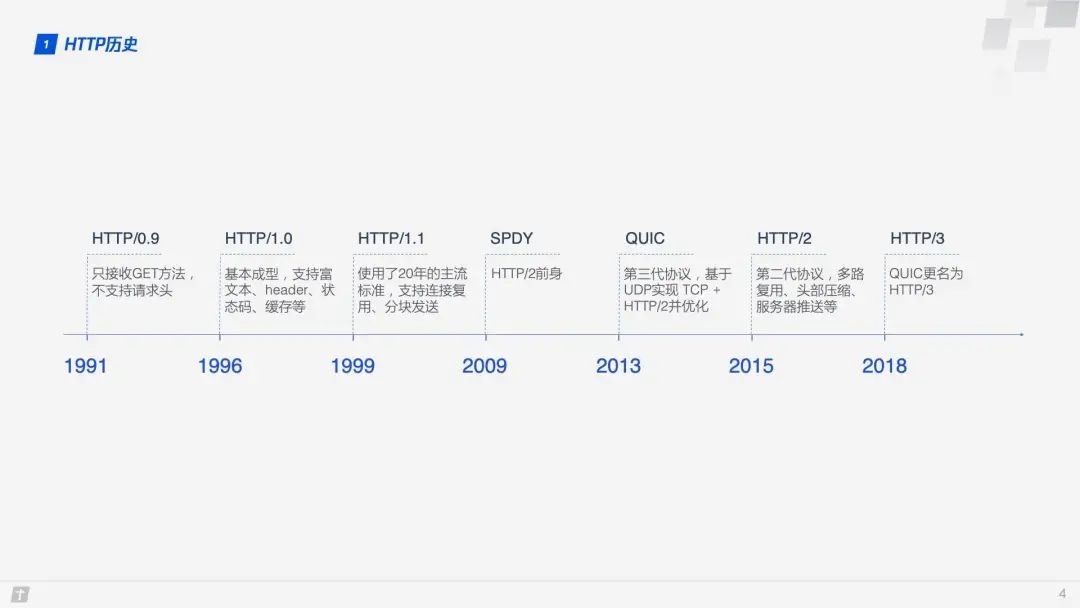2015 年 HTTP/2 标准发表后,大多数主流浏览器也于当年年底支持该标准。此后,凭借着多路复用、头部压缩、服务器推送等优势,HTTP/2 得到了越来越多开发者的青睐。不知不觉的 HTTP 已经发展到了第三代,鹅厂也紧跟技术潮流,很多项目也在逐渐使用 HTTP/3。本文基于兴趣部落接入 HTTP/3 的实践,聊一聊 HTTP/3 的原理以及业务接入的方式。 1. HTTP/3 原理 1.1 HTTP 历史 在介绍 HTTP/3 之前,我们先简单看下 HTTP 的历史,了解下 HTTP/3 出现的背景。