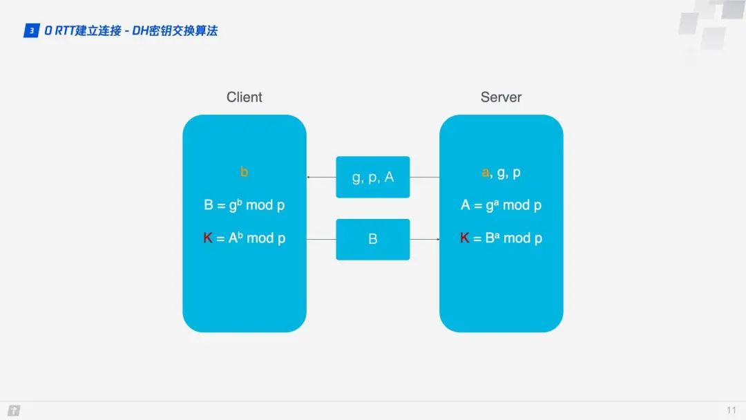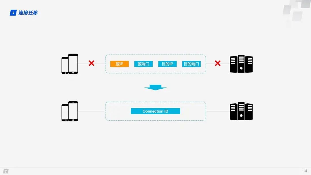 这里使用的是 DH 密钥交换算法,DH 算法的核心就是服务端生成 a、g、p 3 个随机数,a 自己持有,g 和 p 要传输给客户端,而客户端会生成 b 这 1 个随机数,通过 DH 算法客户端和服务端可以算出同样的密钥。在这过程中 a 和 b 并不参与网络传输,安全性大大提高。因为 p 和 g 是大数,所以即使在网络中传输的 p、g、A、B 都被劫持,那么靠现在的计算机算力也没法破解密钥。 1.4 连接迁移 TCP 连接基于四元组(源 IP、源端口、目的 IP、目的端口),切换网络时至少会有一个因素发生变化,导致连接发生变化。当连接发生变化时,如果还使用原来的 TCP 连接,则会导致连接失败,就得等原来的连接超时后重新建立连接,所以我们有时候发现切换到一个新网络时,即使新网络状况良好,但内容还是需要加载很久。如果实现得好,当检测到网络变化时立刻建立新的 TCP 连接,即使这样,建立新的连接还是需要几百毫秒的时间。 QUIC 的连接不受四元组的影响,当这四个元素发生变化时,原连接依然维持。那这是怎么做到的呢?道理很简单,QUIC 连接不以四元组作为标识,而是使用一个 64 位的随机数,这个随机数被称为 Connection ID,即使 IP 或者端口发生变化,只要 Connection ID 没有变化,那么连接依然可以维持。