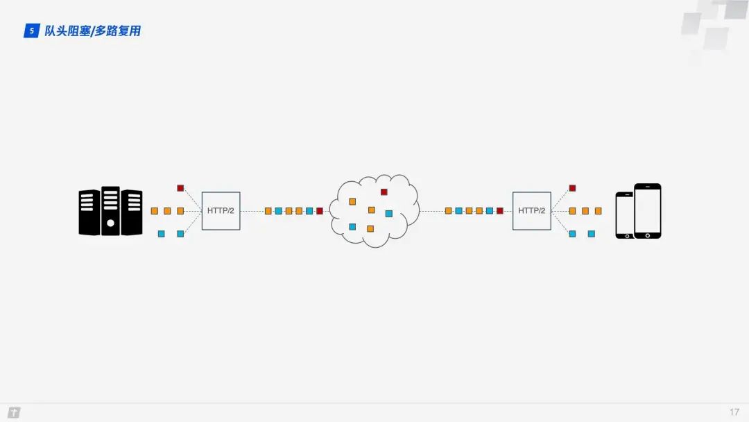 因此,HTTP 一般又允许每个主机建立 6 个 TCP 连接,这样可以更加充分地利用带宽资源,但每个连接中队头阻塞的问题还是存在。 HTTP/2 的多路复用解决了上述的队头阻塞问题。不像 HTTP/1.1 中只有上一个请求的所有数据包被传输完毕下一个请求的数据包才可以被传输,HTTP/2 中每个请求都被拆分成多个 Frame 通过一条 TCP 连接同时被传输,这样即使一个请求被阻塞,也不会影响其他的请求。如下图所示,不同颜色代表不同的请求,相同颜色的色块代表请求被切分的 Frame。
