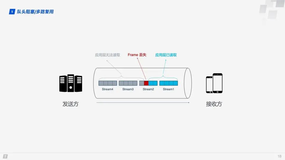 事情还没完,HTTP/2 虽然可以解决“请求”这个粒度的阻塞,但 HTTP/2 的基础 TCP 协议本身却也存在着队头阻塞的问题。HTTP/2 的每个请求都会被拆分成多个 Frame,不同请求的 Frame 组合成 Stream,Stream 是 TCP 上的逻辑传输单元,这样 HTTP/2 就达到了一条连接同时发送多条请求的目标,这就是多路复用的原理。我们看一个例子,在一条 TCP 连接上同时发送 4 个 Stream,其中 Stream1 已正确送达,Stream2 中的第 3 个 Frame 丢失,TCP 处理数据时有严格的前后顺序,先发送的 Frame 要先被处理,这样就会要求发送方重新发送第 3 个 Frame,Stream3 和 Stream4 虽然已到达但却不能被处理,那么这时整条连接都被阻塞。