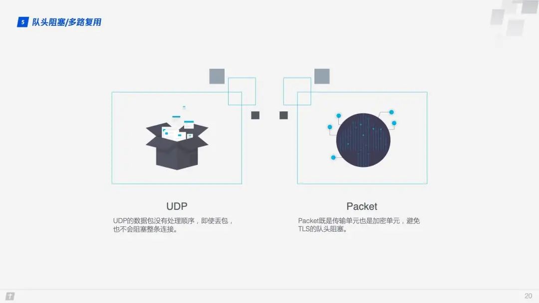 队头阻塞会导致 HTTP/2 在更容易丢包的弱网络环境下比 HTTP/1.1 更慢! 那 QUIC 是如何解决队头阻塞问题的呢?主要有两点。 QUIC 的传输单元是 Packet,加密单元也是 Packet,整个加密、传输、解密都基于 Packet,这样就能避免 TLS 的队头阻塞问题; QUIC 基于 UDP,UDP 的数据包在接收端没有处理顺序,即使中间丢失一个包,也不会阻塞整条连接,其他的资源会被正常处理。