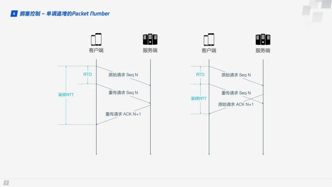1.6.3 单调递增的 Packet Number TCP 为了保证可靠性,使用 Sequence Number 和 ACK 来确认消息是否有序到达,但这样的设计存在缺陷。 超时发生后客户端发起重传,后来接收到了 ACK 确认消息,但因为原始请求和重传请求接收到的 ACK 消息一样,所以客户端就郁闷了,不知道这个 ACK 对应的是原始请求还是重传请求。如果客户端认为是原始请求的 ACK,但实际上是左图的情形,则计算的采样 RTT 偏大;如果客户端认为是重传请求的 ACK,但实际上是右图的情形,又会导致采样 RTT 偏小。图中有几个术语,RTO 是指超时重传时间(Retransmission TimeOut),跟我们熟悉的 RTT(Round Trip Time,往返时间)很长得很像。采样 RTT 会影响 RTO 计算,超时时间的准确把握很重要,长了短了都不合适。