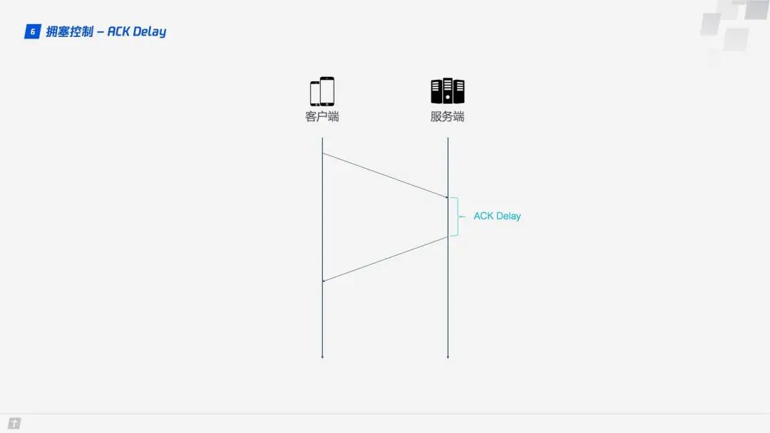 1.6.4 ACK Delay TCP 计算 RTT 时没有考虑接收方接收到数据到发送确认消息之间的延迟,如下图所示,这段延迟即 ACK Delay。QUIC 考虑了这段延迟,使得 RTT 的计算更加准确。