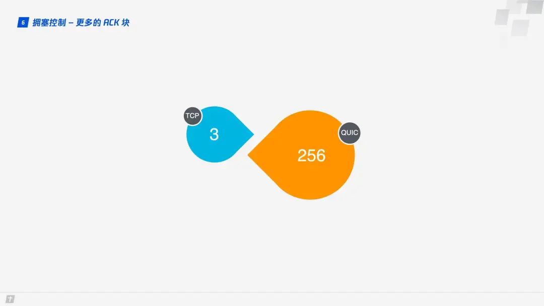 1.6.5 更多的 ACK 块 一般来说,接收方收到发送方的消息后都应该发送一个 ACK 回复,表示收到了数据。但每收到一个数据就返回一个 ACK 回复太麻烦,所以一般不会立即回复,而是接收到多个数据后再回复,TCP SACK 最多提供 3 个 ACK block。但有些场景下,比如下载,只需要服务器返回数据就好,但按照 TCP 的设计,每收到 3 个数据包就要“礼貌性”地返回一个 ACK。而 QUIC 最多可以捎带 256 个 ACK block。在丢包率比较严重的网络下,更多的 ACK block 可以减少重传量,提升网络效率。