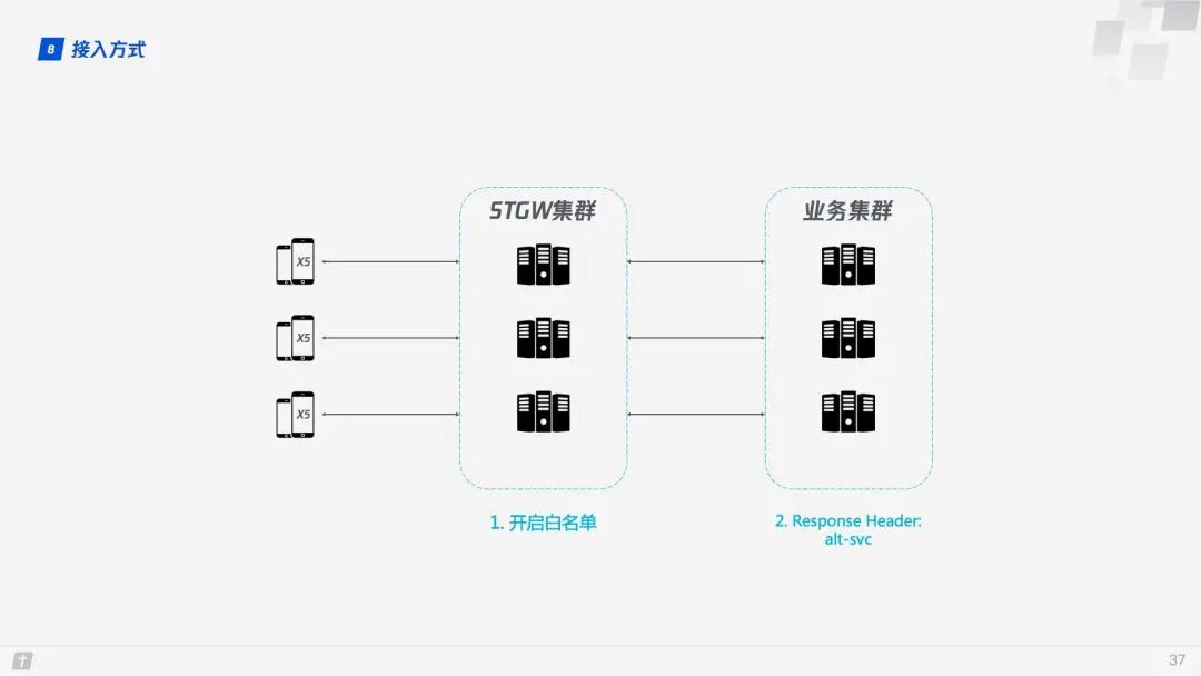 Stream 级别对防止接收端接收过多数据作用有限,更需要借助 Connection 级别的流量控制。理解了 Stream 流量那么也很好理解 Connection 流控。Stream 中,接收窗口(flow control receive window) = 最大接收窗口(max receive window) - 已接收数据(highest received byte offset) ,而对 Connection 来说:接收窗口 = Stream1 接收窗口 + Stream2 接收窗口 + ... + StreamN 接收窗口 。 2. HTTP/3 实践 2.1 X5 内核与 STGW X5 内核是腾讯开发的适用于安卓系统的浏览器内核,为了解决传统安卓系统浏览器内核适配成本高、不安全、不稳定等问题而开发的统一的浏览器内核。STGW 是 Secure Tencent Gateway 的缩写,意思是腾讯安全云网关。两者早在前两年便支持了 QUIC 协议。 那作为运行在 X5 上的业务,我们该如何接入 QUIC 呢?得益于 X5 和 STGW,业务在接入 QUIC 时所需要做的改动非常小,只需要两步。 Step 1. 在 STGW 上开启白名单,允许业务域名接入 QUIC 协议; Step 2. 业务资源的 Response Header 添加 alt-svc 属性,示例:alt-svc: quic=":443"; ma=2592000; v="44,43,39"。