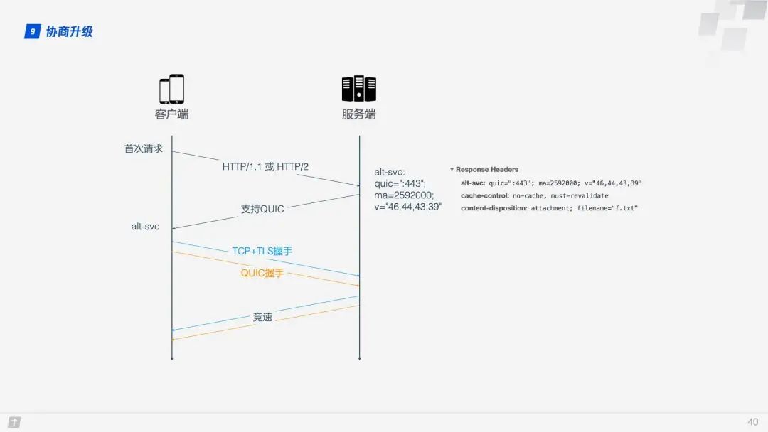 接入 QUIC 时,STGW 的优势非常明显,由 STGW 与支持 QUIC 的客户端(这里是 X5)进行通信,而业务后台与 STGW 仍然使用 HTTP/1.1 通信,QUIC 所需要的 Server Config 等缓存信息也都是由 STGW 维护。 2.2 协商升级与竞速 业务域名加入了 STGW 的白名单,业务资源的 Response Header 也添加了 alt-svc 属性,那 QUIC 是如何建立连接的呢?这里有个关键的步骤:协商升级。客户端不确定服务器是否支持 QUIC,如果贸然地请求建立 QUIC 连接可能会失败,所以需要经历协商升级过程才能决定是否使用 QUIC。