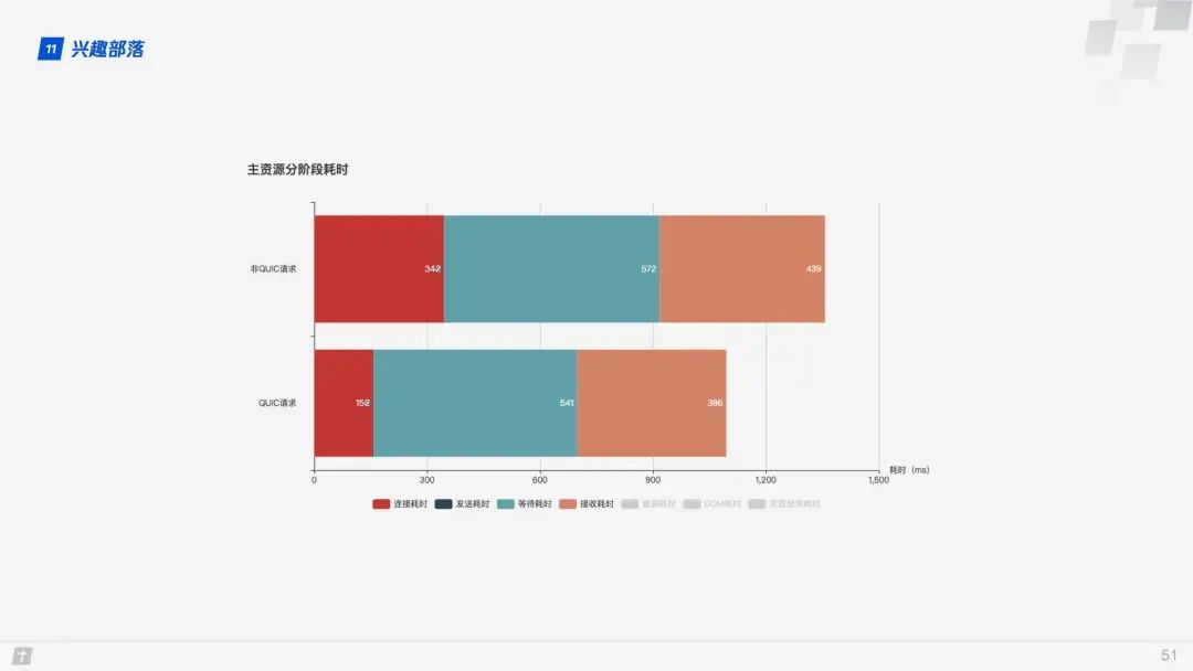 从资源获取的不同阶段看,QUIC 协议在连接阶段节省的时间比较明显。