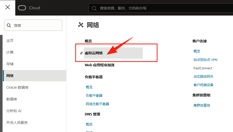 登录 OCI 控制台,左上角导航至 网络 (Networking) -> 虚拟云网络 (Virtual Cloud Networks)