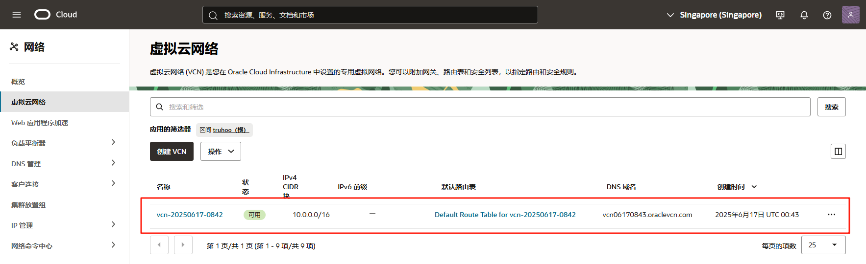 选择目标 VCN。如图所示,选择刚创建的VCN,点击进入详情页面。