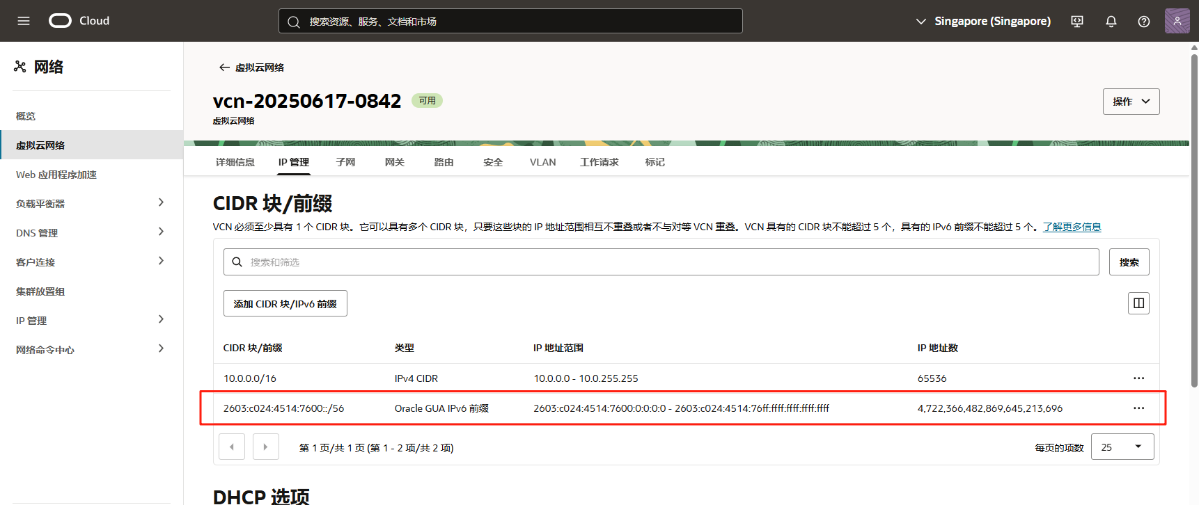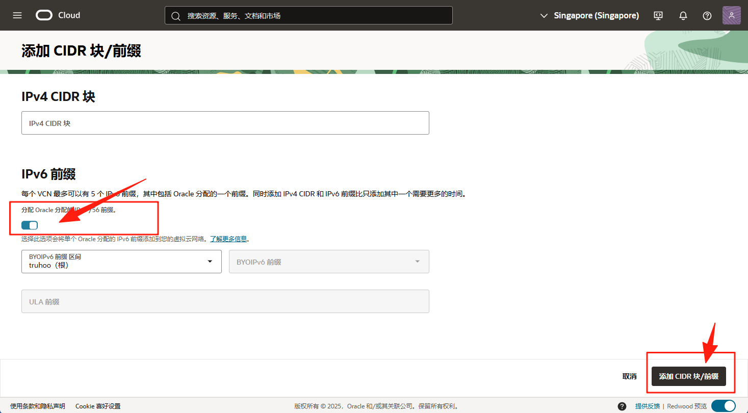 勾选 分配 Oracle 分配的IPv6 /56 前缀 (Assign an Oracle allocated /56 prefix) 的选项。这是最常见的方式。最后点击 添加 CIDR块。OCI 会自动为你的 VCN 指派一个全局单播地址 (GUA) /56 前缀,OIC会自动返回IP管理界面,稍等下,会自动刷新出IPv6地址。