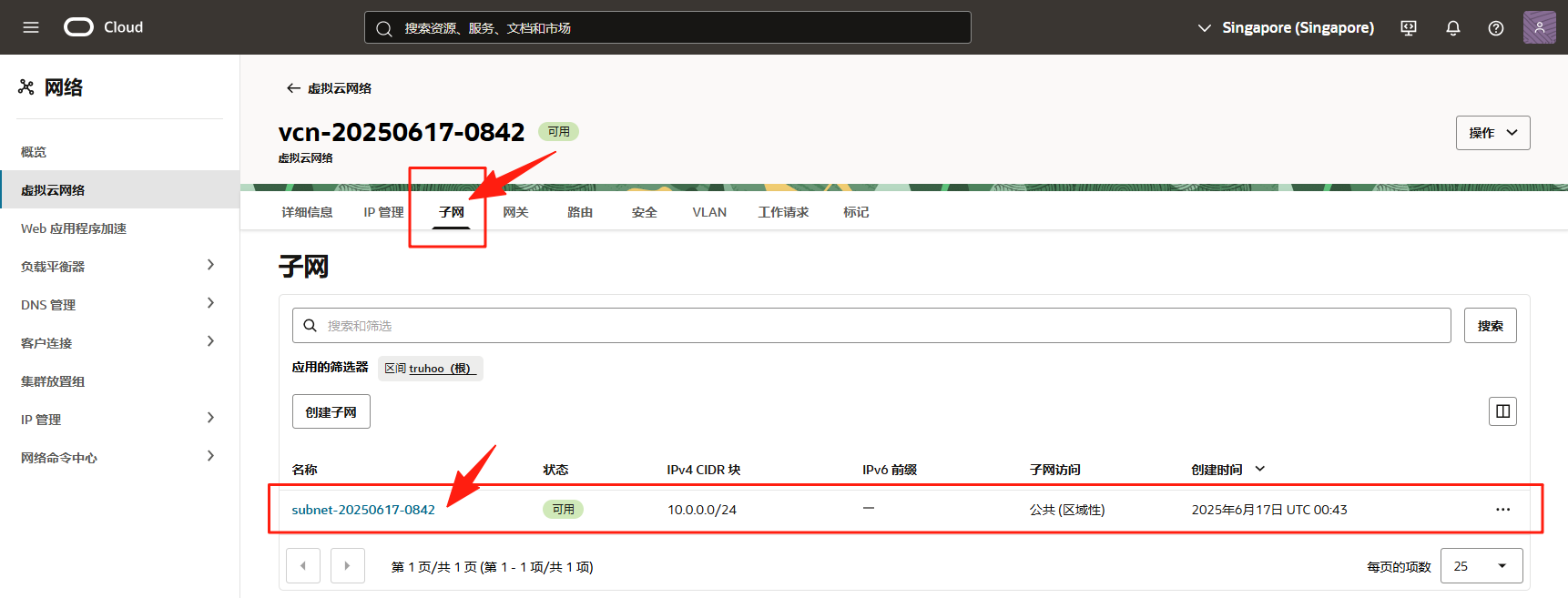 还是刚才的 VCN 详情页面,点击菜单中的 子网 (Subnets),选择目标子网。
