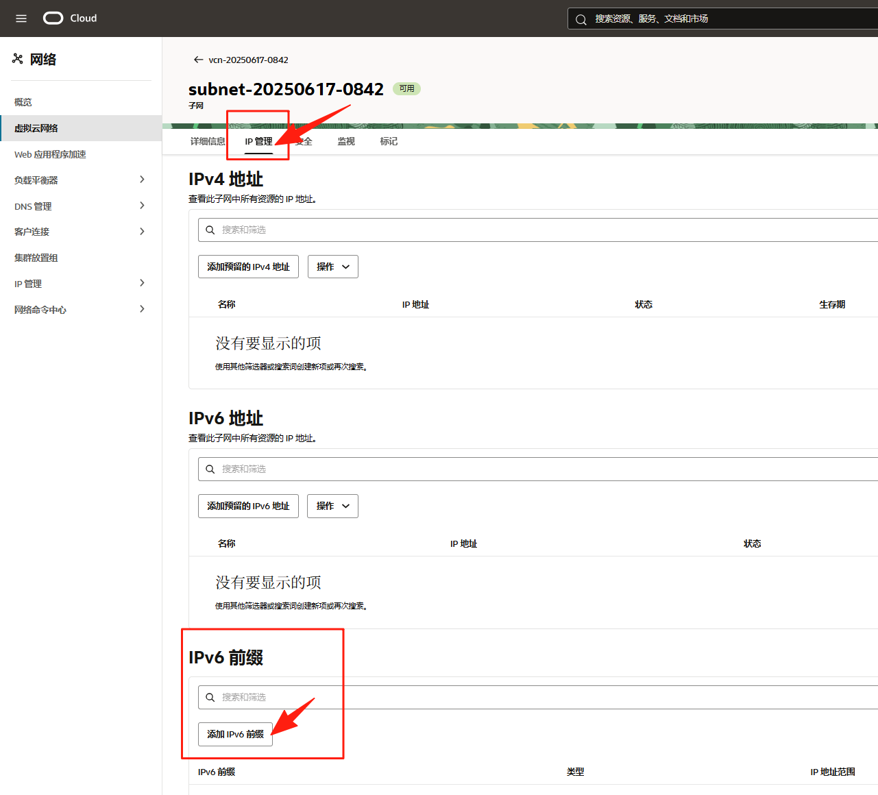 在 VCN 详情页面,导航到IP管理–>找到 CIDR 块 /前缀 部分。