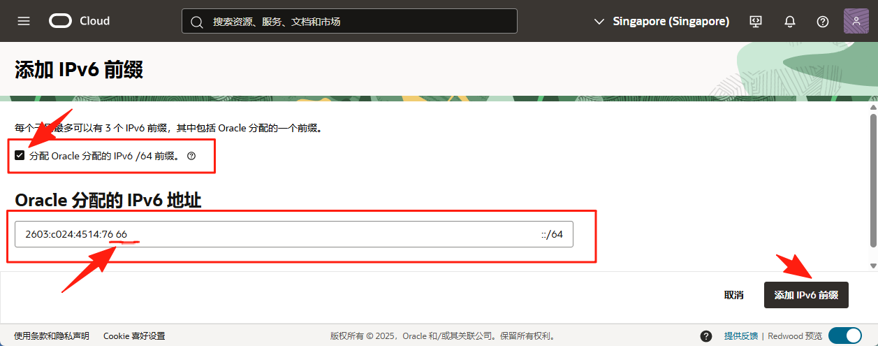 进入添加IPv6前缀页面,勾选分配 Oracle 分配的 IPv6 /64 前缀, Oracle分配的IPv6地址 字段,输入两个十六进制字符 (00-FF),如我这边我输入的【66】 ,点击右下角 添加IPv6前缀