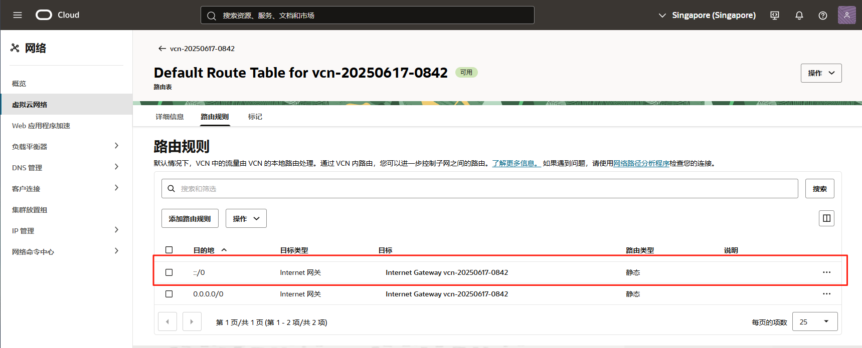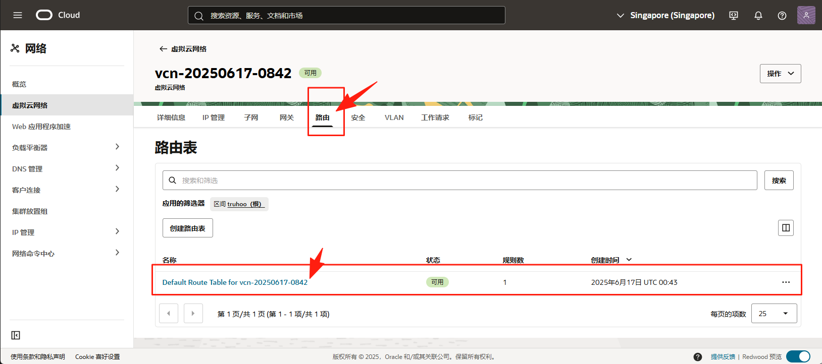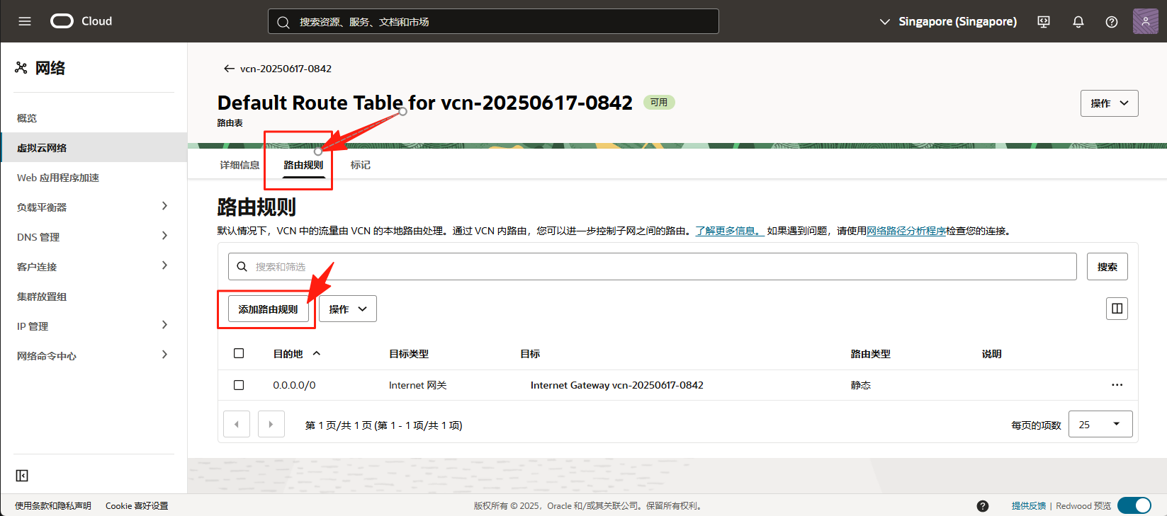 在 VCN 详情页面,点击菜单中的 路由,选择子网默认关联的那个路由表,进入路由详情页面。