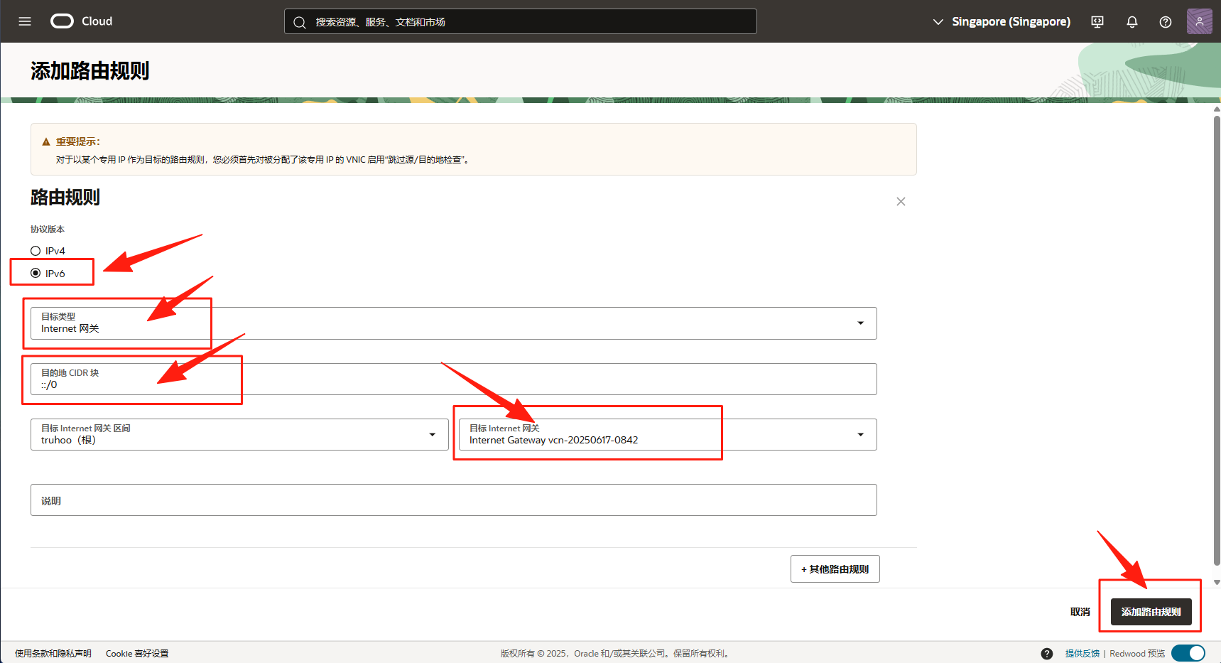 目标 CIDR 块 (Destination CIDR Block): 输入 ::/0 (这代表互联网上的所有 IPv6 地址)。