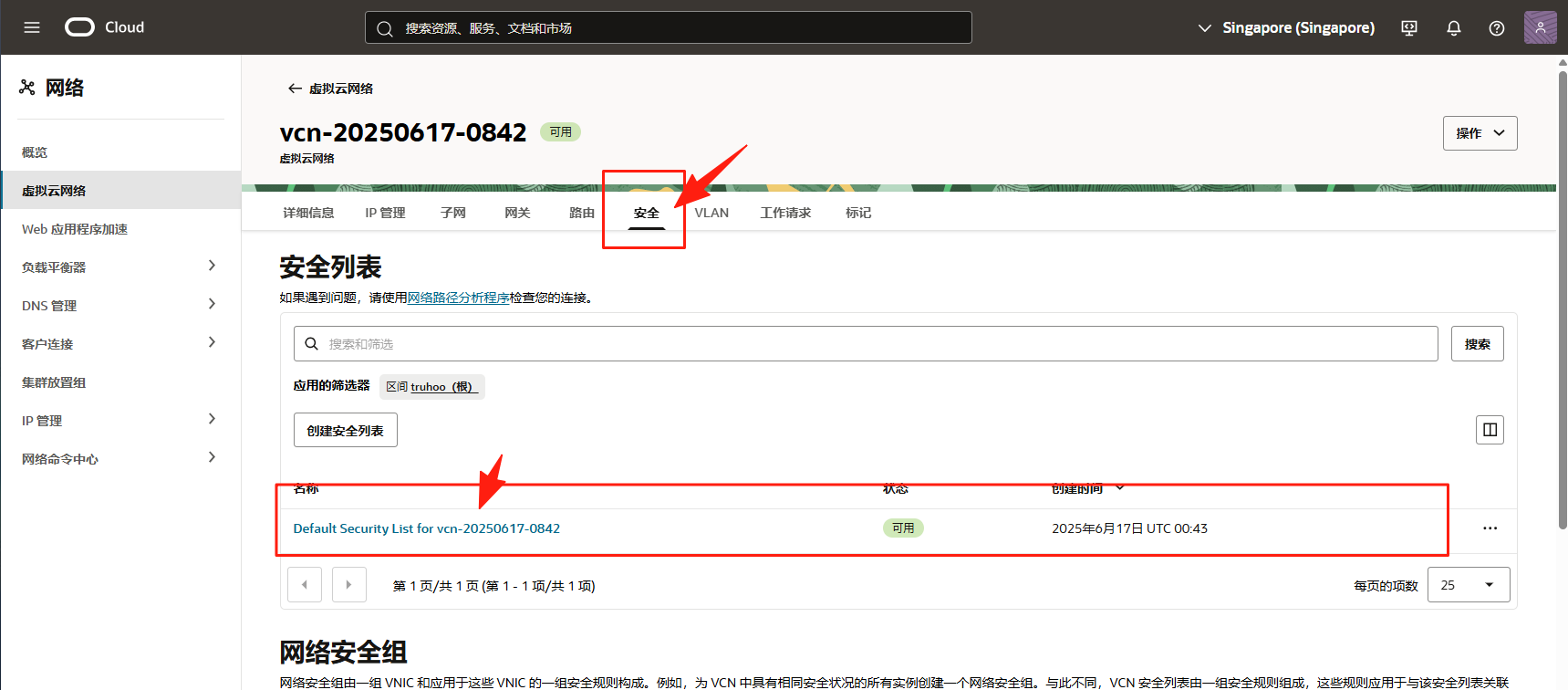 在 VCN 详情页面,点击菜单中的 安全,如图选择默认的安全列表。