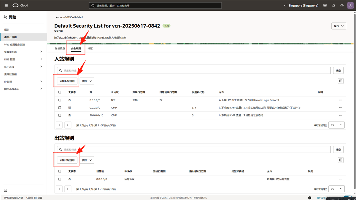 需要更新与实例 VNIC 关联的安全列表 (Security List) 或添加了网络安全组 (Network Security Group, NSG)。默认使用的防火墙类型是安全列表,如果你添加了网络安全组也要添加对应的规则。