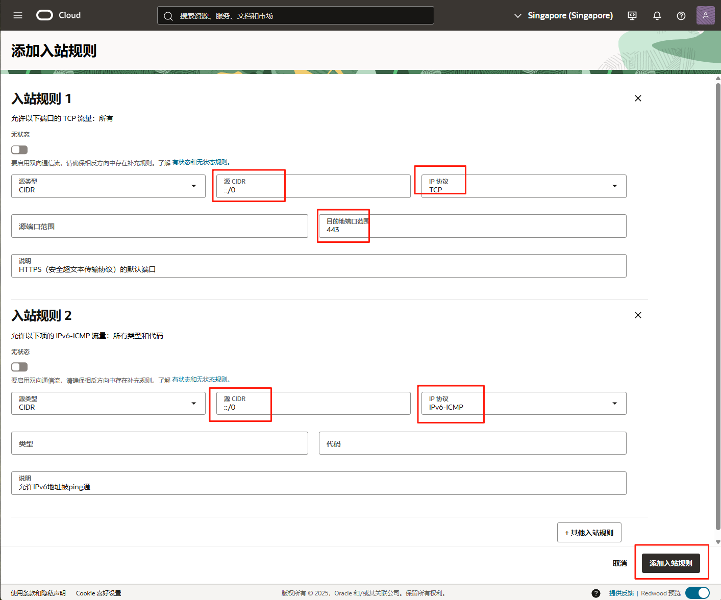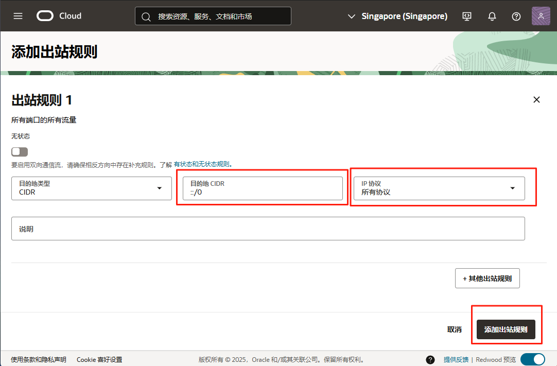 放行所有出站 IPv6 流量(服务器才能使用IPv6上网),目的地类型: CIDR, 目的地CIDR::/0, IP协议所有协议,最后添加出站规则。