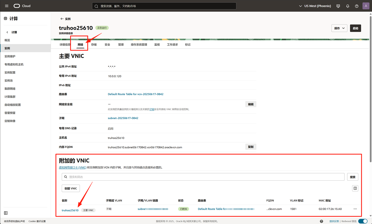 导航至 计算 (Compute) -> 实例 (Instances),选择目标实例,在实例详情页面,菜单栏切换到网络,向下滚动到 附加的 VNIC (Attached VNICs) 部分,点击实例的主 VNIC,在 VNIC 详情页面。