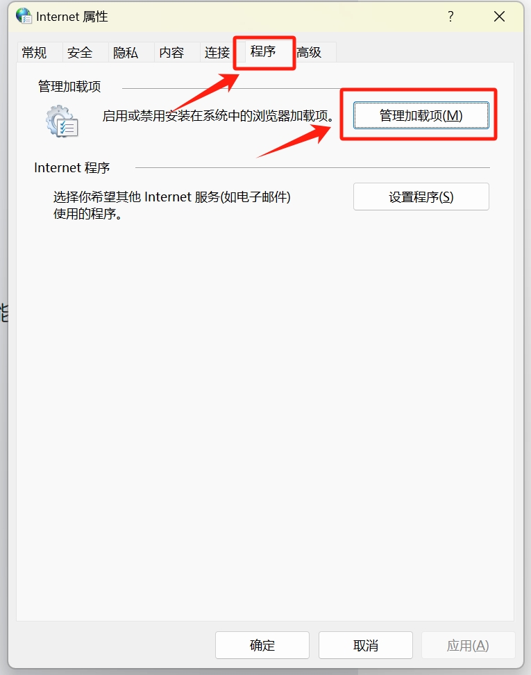 4、选择 程序 选项卡,点击 管理加载项 按钮