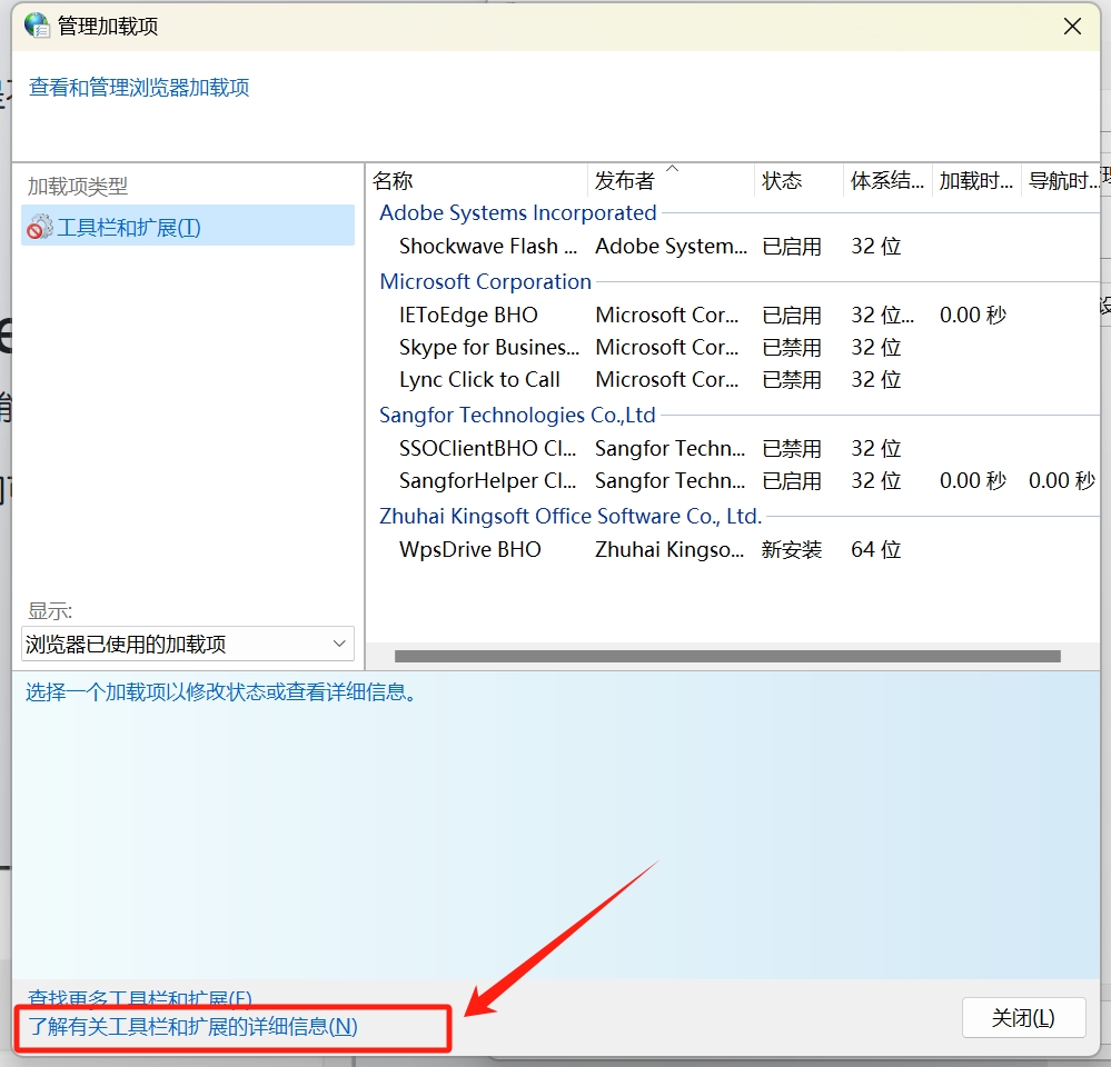 5、然后,点击窗口底部 了解有关工具栏和扩展的详细信息