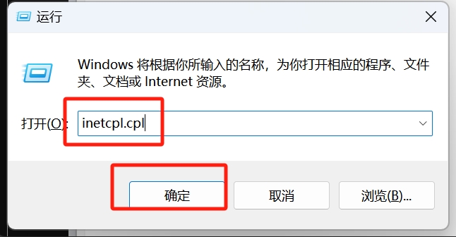 2、接下来,在运行命令框中输入 inetcpl.cpl