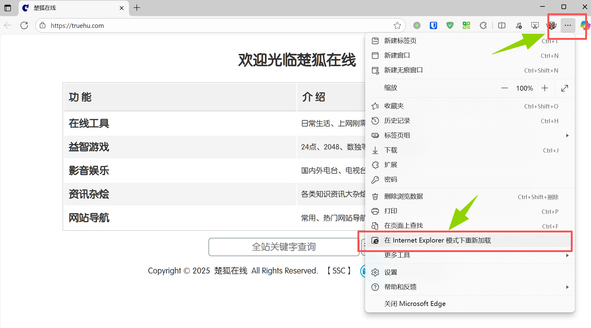 Microsoft Edge 中的 Internet Explorer 模式提供了在Edge浏览器中试用IE的功能,但是功能不够完整,如提供兼容性视图设置等找不到入口,若需要请 参照方法二体验完整的IE功能 。